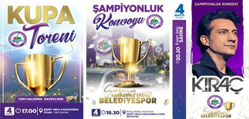 Kdz. Ereğli Belediyespor, 23 yıl aradan sonra Pazar günü şampiyonluk kupasına kavuşuyor. Beyçayırı Şehit Vefa Karakurdu stadında oynanacak Geredespor maçının hemen ardından kupa töreni yapılacak, ardından şampiyon takım Ereğli turu atacak. Şampiyonluk coşkusu Anıt önünde Kıraç konseriyle final yapacak. Haydi Ereğli, sende formanı giy, şampiyonluk coşkusuna ortak ol..