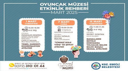 Kdz. Ereğli Belediyesi Oyuncak Müzesi Koordinatörü Melih Can Tanrıkulu, Mart ayı içerisinde gerçekleşecek atölye çalışmalarını açıkladı. Oyuncak Müzesi Atölye çalışmalarına katılmak isteyen veliler 0372 310 01 44 numaralı telefondan ön kayıt yaptırabilirler.