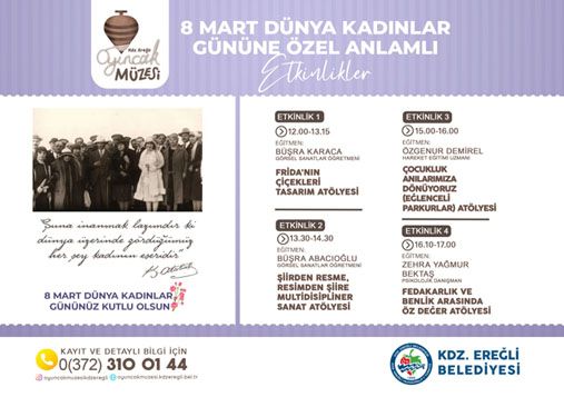 Kdz. Ereğli Belediyesi Oyuncak Müzesi Koordinatörü Melih Can Tanrıkulu, 8 Mart Dünya Kadınlar Günü’nde Oyuncak Müzesi’nde 4 ayrı etkinlik düzenleneceğini bildirdi.