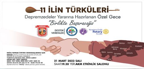6 Şubat 2023 ‘de Saat 04:17’de meydana gelen ve 11 ilimizi etkileyen depremdeki vatandaşlarımızın yaralarını bir nebze de olsa sarabilmek için 21 Mart 2023 Salı akşamı saat 19.30’da yenilenen AKM Etkinlik Salonu’nda düzenlenecek “11 İLİN TÜRKÜLERİ” Özel Gecesi’nde bir araya geliyoruz.