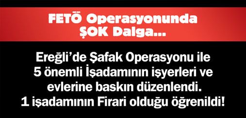 Ereğli'de Şafak Operasyonu ile 5 önemli İşadamının işyerleri ve evlerine baskın düzenlendi. 1 işadamının Firari olduğu öğrenildi! Kdz. Ereğli'de FETÖ/PDY terör örgütü soruşturması kapsamında İlçe Emniyet Müdürlüğü'ne bağlı çok sayıda polis ekibi sabah saatlerinde operasyon gerçekleştirdi.