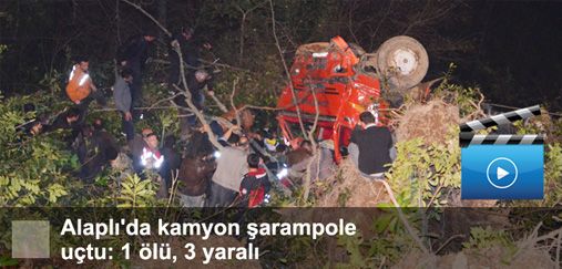 Alaplı'da yakınlarında tomruk yüklü kamyonun 50 metrelik şarampole yuvarlanması sonucu 1 kişi öldü, biri ağır 3 kişi yaralandı.