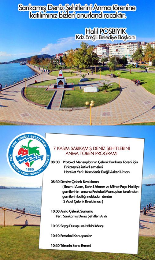 Kdz.Ereğli Belediyesi tarafından 7 Kasım Sarıkamış Deniz Şehitlerini Anma Tören Programı düzenlenecek.