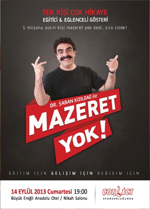 14 Eylül 2013 Cumartesi günü önceki dönem Karadeniz Ereğli Belediye Başkanı Murat SESLİ tarafından Sosyal Sorumluluk Projesi ve “Ereğli Sesli Düşünecek” sloganı doğrultusunda organizasyonu yapılan ve Dr. Şaban KIZILDAĞ'ın sunduğu, bugüne dek 1 milyon kişinin izlediği “Mazeret Yok” isimli eğitici gösteri saat 19.30'da Büyük Ereğli Anadolu Otel'de Karadeniz Ereğli halkı ile buluştu.