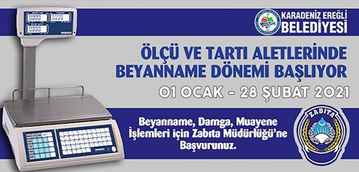 Kdz. Ereğli Belediyesi Zabıta Müdürlüğü, ticari amaçla kullanılan ölçü ve tartı aletlerinin periyodik muayenelerinin 28 Şubat 2021 tarihine kadar yaptırılmasının zorunlu olduğunu duyurdu.