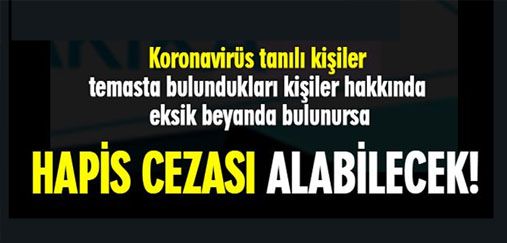 İçişleri Bakanlığı koronavirüs tanılı kişiler, temasta bulundukları kişiler hakkında eksik ya da yalan beyanda bulunmaları halinde Türk Ceza Kanununun 206’ ncı maddesi kapsamında üç aydan iki yıla kadar hapis veya adlî para cezası ile cezalandırılacağını bildirdi.