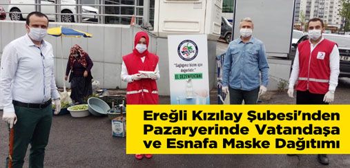 Türk Kızılay Karadeniz Ereğli Şubesi Başkanı Yaşar CİĞER Cumartesi Pazarı bölgesinde bugün kurulan açık halk pazarındaki girişlere konuşlanarak, maskesiz olan ya da ihtiyacı olan esnaf ya da vatandaşa maske ve dezenfektan dağıttılar.