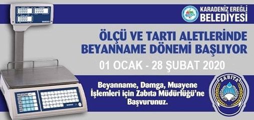 Kdz. Ereğli Belediyesi Zabıta Müdürlüğü, ticari amaçla kullanılan ölçü ve tartı aletlerinin periyodik muayenelerinin 28 Şubat 2020 tarihine kadar yaptırılmasının zorunlu olduğunu duyurdu.