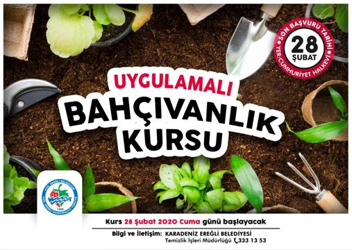 Kdz. Ereğli Belediyesi Temizlik İşleri Müdürlüğü Park Bahçeler Birimi tarafından üçüncüsü düzenlenecek Uygulamalı Bahçıvanlık Kursu için kayıtlar başladı, ilgililer 28 Şubat'a kadar başvuru yapabilecek.