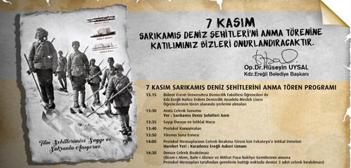 Sarıkamış'ta donarak şehit olan 90 bin askere kışlık giyecek, erzak ve mühimmat götürürken, 7 Kasım 1914'te Ereğli açıklarında Rus donanması tarafından batırılan "Bezm-i Alem", "Bahr-i Ahmer" ve "Mithat Paşa" gemilerinin mürettebatı için Kdz.Ereğli’de anma töreni düzenlenecek.