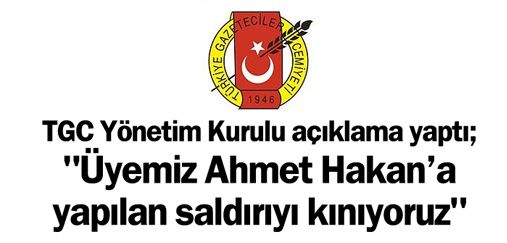 Hürriyet Gazetesi köşe yazarı Ahmet Hakan’a ve korumasına yapılan saldırıyla ilgili bir açıklama yapan Türkiye Gazeteciler Cemiyeti Yönetim Kurulu, “Üyemiz Ahmet Hakan’a yapılan saldırıyı kınıyoruz. Ahmet Hakan’ı hedef gösteren, ölümle tehdit eden kişilerle ilgili İçişleri Bakanlığı’nı göreve çağırıyoruz” dedi. TGC Yönetim Kurulu’nun açıklamasında şunlar yer aldı: