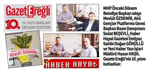 MHP Önceki Dönem Belediye Başkan adayı Mevlüt ÖZDEMİR, Akil Gençler Platformu Genel Başkan Basın Danışmanı Sedat BEŞEVLİ, Haber Hayat Gazetesi İmtiyaz Sahibi Doğan GÖNÜLLÜ ve Yeni Haber Yazı İşleri Müdürü Hasan HAŞIL Gazete Ereğli'nin 10. yılını kutladılar.